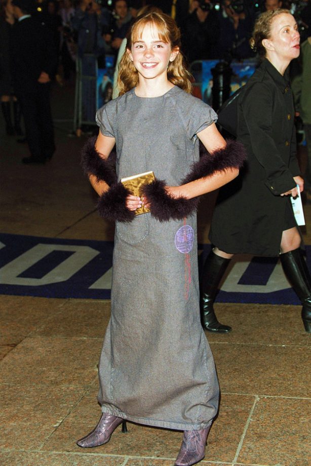 These photos were taken in her very early career. We can see the change of how Emma Watson style herself. On the left, she was wearing a grey maxi and sweet bolero for her first Harry Potter premiere in 2001. The long black dress in the middle was for